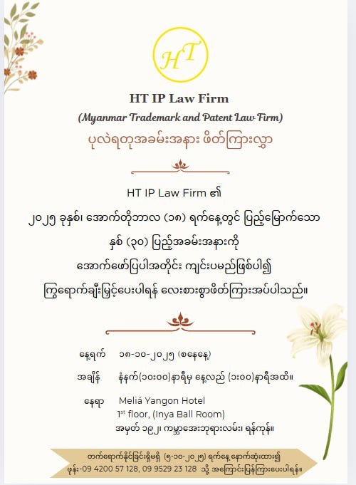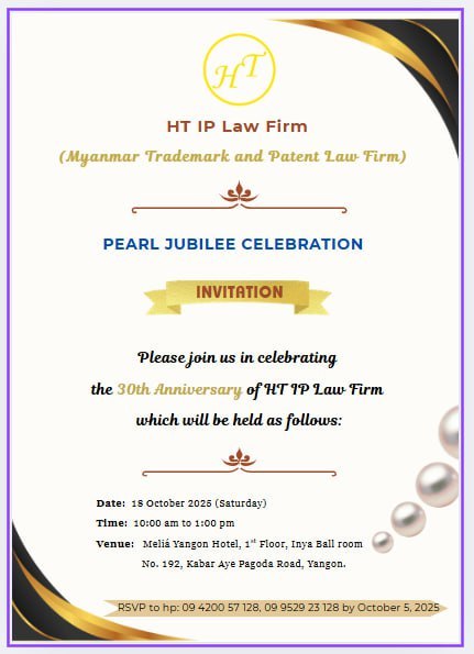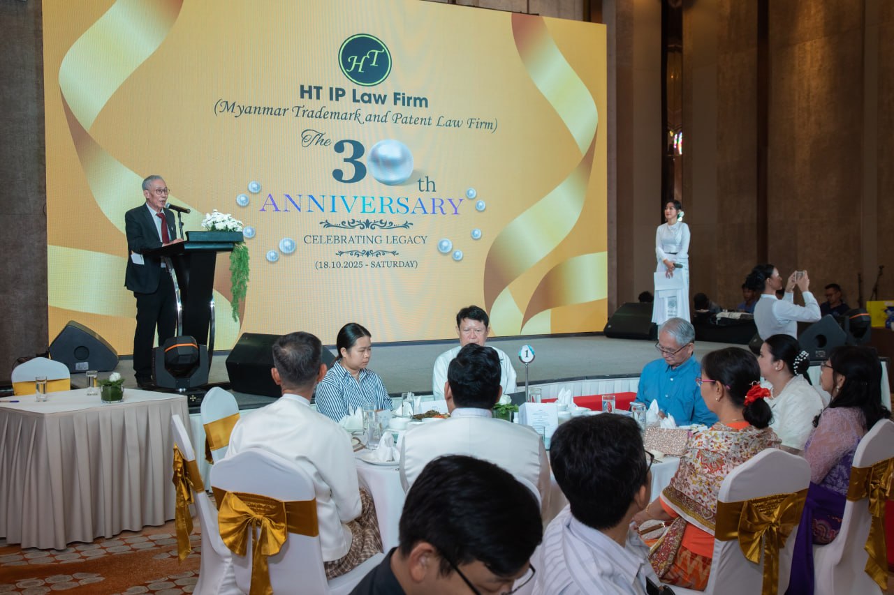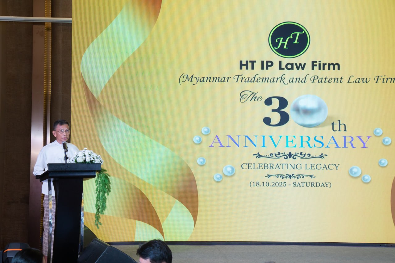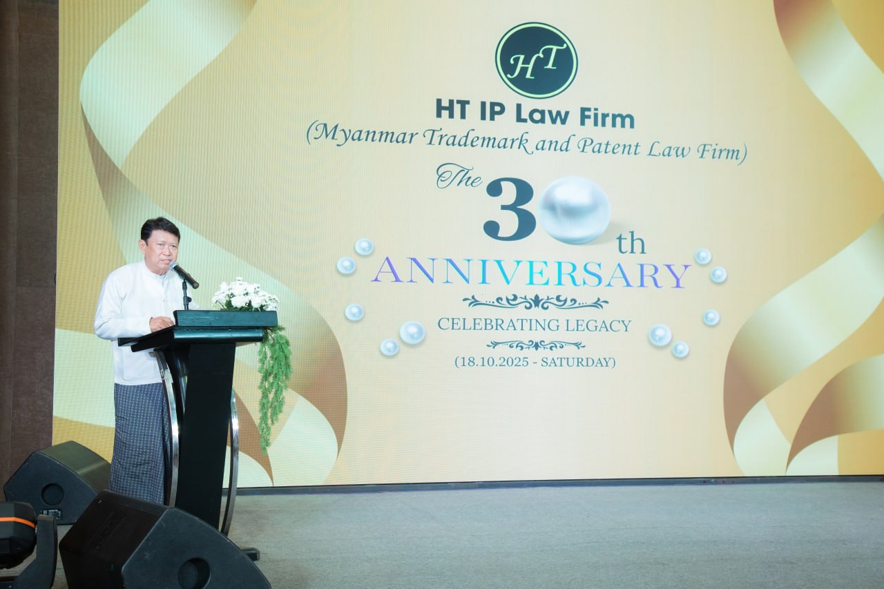HT IP Law Firm proudly celebrated its 30th Anniversary (Pearl Jubilee) today, marking three decades of dedicated service in the field of Intellectual Property law. The grand ceremony was held at the Inya Ballroom (1st Floor) of the Meliá Yangon Hotel from 10:00 AM to 1:00 PM. The milestone event was attended by distinguished government officials, prominent legal professionals, and esteemed clients, reflecting the firm’s deep roots and leadership in Myanmar’s legal community.